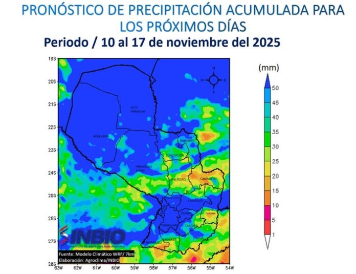 Las últimas estimaciones meteorológicas anticipan lluvias generalizadas en gran parte del territorio nacional, con acumulados que oscilarían entre los 20 mm y más de 50 mm. Este escenario se concentraría especialmente en el centro, norte y sur de la Región Oriental, así como en amplios sectores de la Región Occidental.